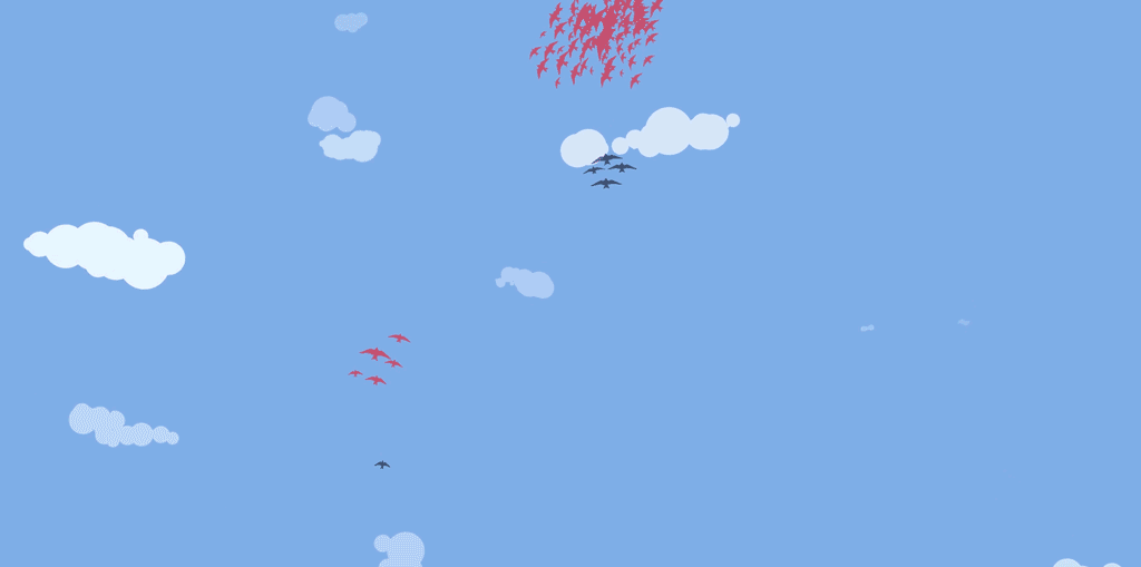 The behaviour and environment is all procedurally generated (sorry!) Wind gusts a bit if you press the mouse. Camera follows the black birds around, the black birds hunt the red birds, and the red birds feed on the clouds...
